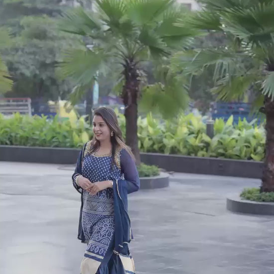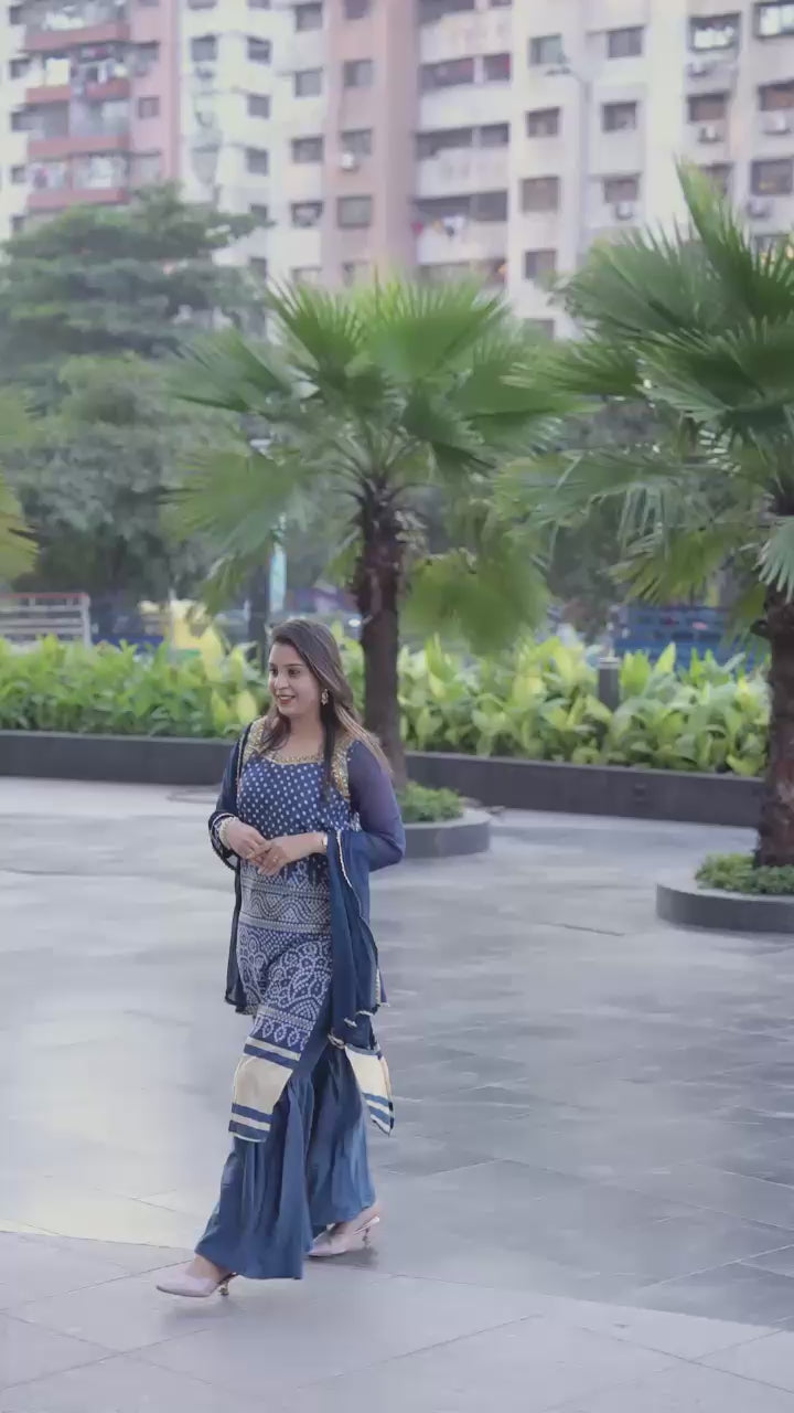 Step into effortless elegance with this beautifully designed 3-piece Kurti Sharara set in a rich navy blue shade. Crafted from lightweight Chinon fabric, this ensemble features delicate cotton thread embroidery that adds a refined and graceful touch.