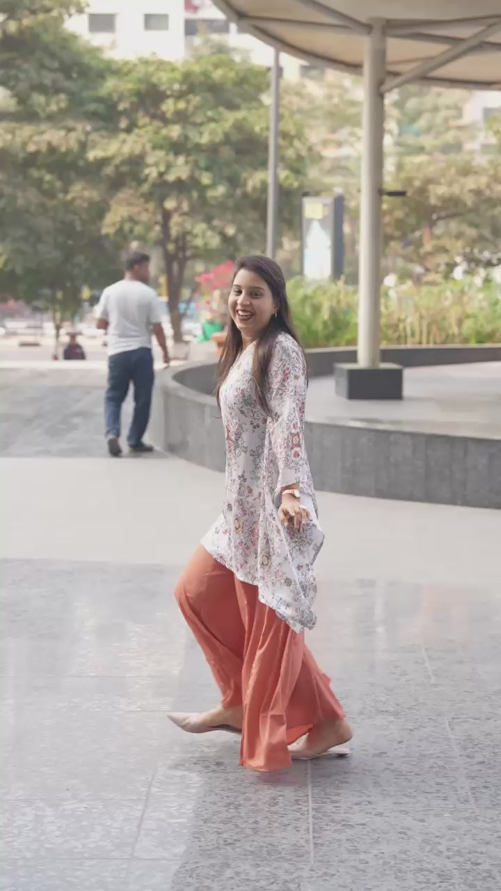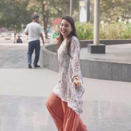 The top features a soft and luxurious Modal Satin fabric adorned with a delicate digital floral print and intricate neckline detailing. Paired with a flowy Natural Crepe Sharara in a rich rust/terracotta shade, this set creates a perfect balance of grace and contemporary charm.